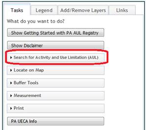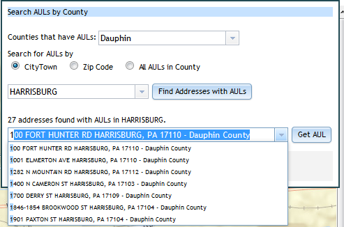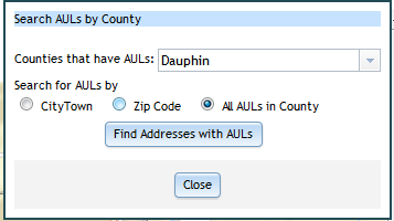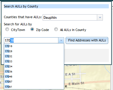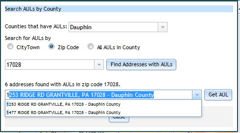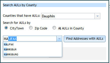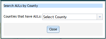 county is selected, you have the option to search for AULs by City/Town, Zip